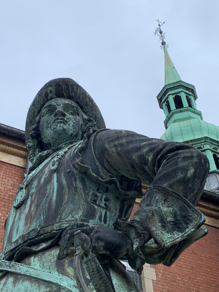 Skulpturen viser en rank, selvbevidst ung mand, der drejer hovedet let med venstre – måske for at se efter den svenske flåde. Han bærer en bredskygget hat over det lange krøllede hår (eller paryk). Han er iført en langærmet kofte, hvorover han har en kort vest, der holdes på plads af et smalt bælte. Kraven breder sig som tætte bølger om halsen. Han har en stor medaljon fortil på brystet. Han bærer høje støvler, der slutter med en bred ombøjning. Den behandskede højre hånd holder fast om hvad der ligner dokumentermens den venstre er anbragt på hoftekammen lige over skæftet på den hængende kårde i sin skede, delvist stukket ind bag koften.